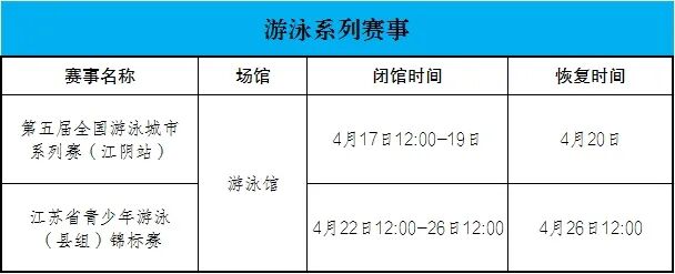 四月春光正好,霞客故里江阴即将迎来两场高规格大型游泳赛事。为高标准做好赛事筹备、场地布置、秩序保障等服务工作,全力护航赛事平稳有序、精彩圆满举办,“水蘑方”游泳馆将结合赛程安排,对日常开放时段进行临时调整,具体安排如下: