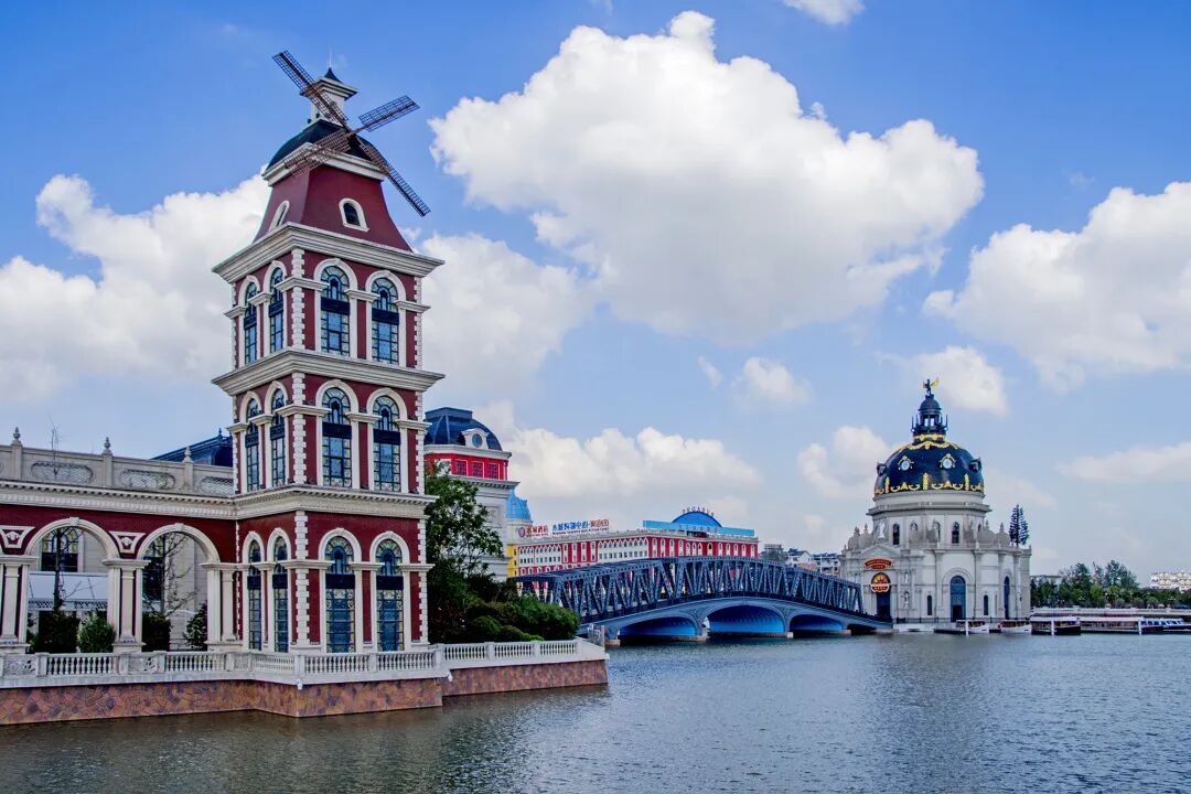 飞马水城以威尼斯水城为原型,园区内随处可见的欧式宫殿建筑群映衬在湖天一色之间,点缀其间的中式元素融于欧陆风情之中,雍容典雅又不失传统的东方神韵。