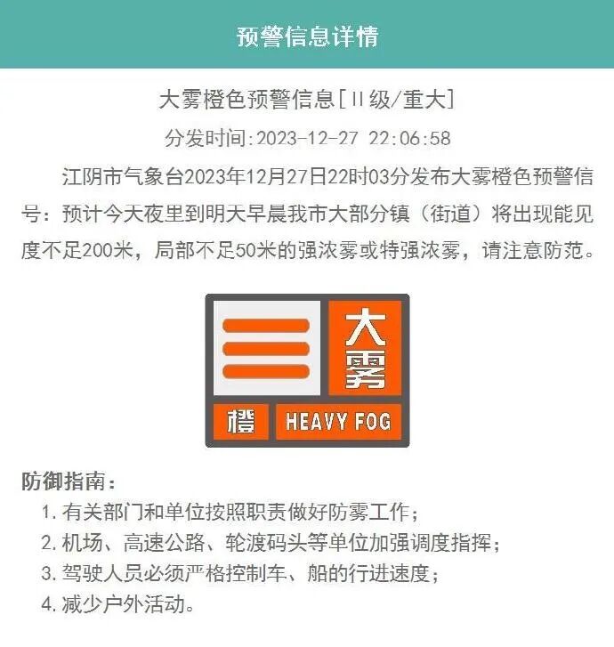 预计今天夜里到明天早晨我市大部分镇(街道)将出现能见度不足200米,局部不足50米的强浓雾或特强浓雾,请注意防范。