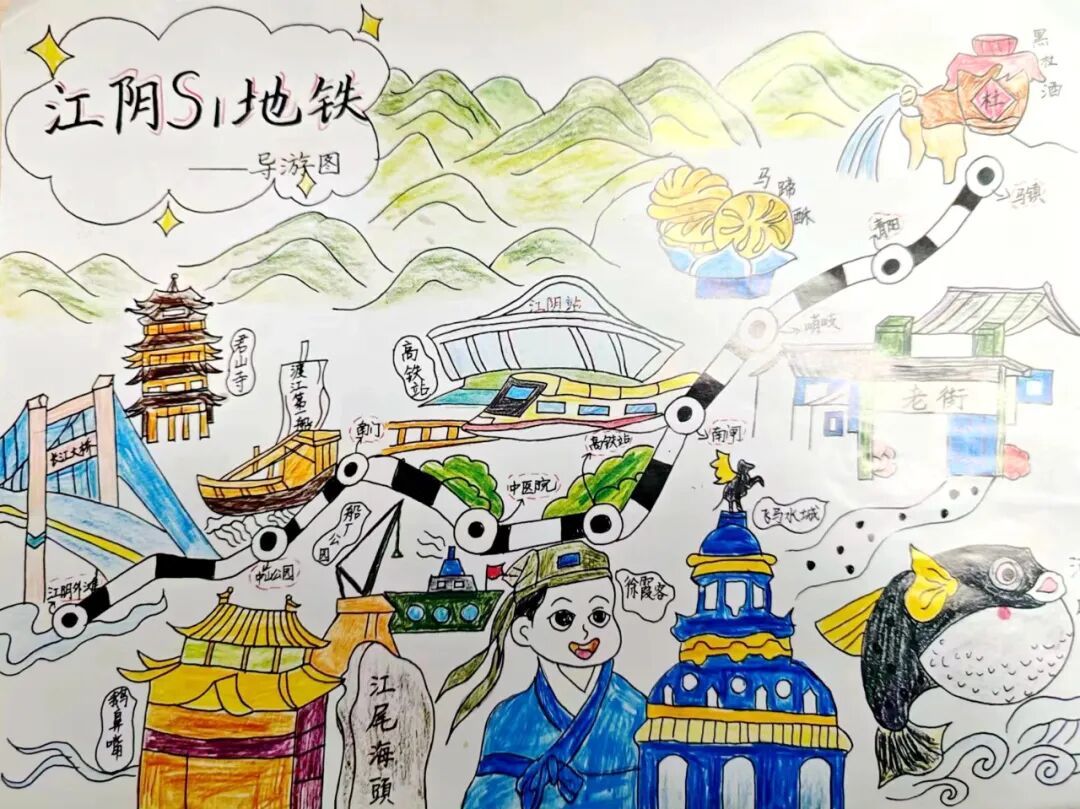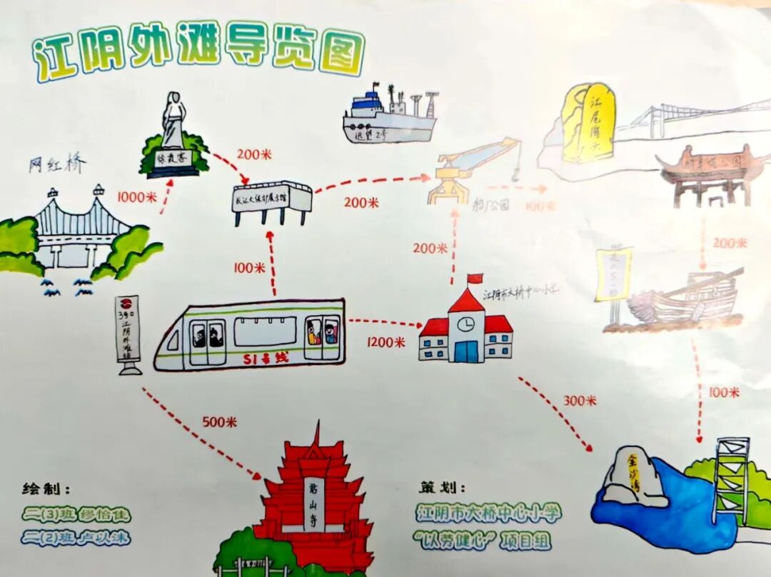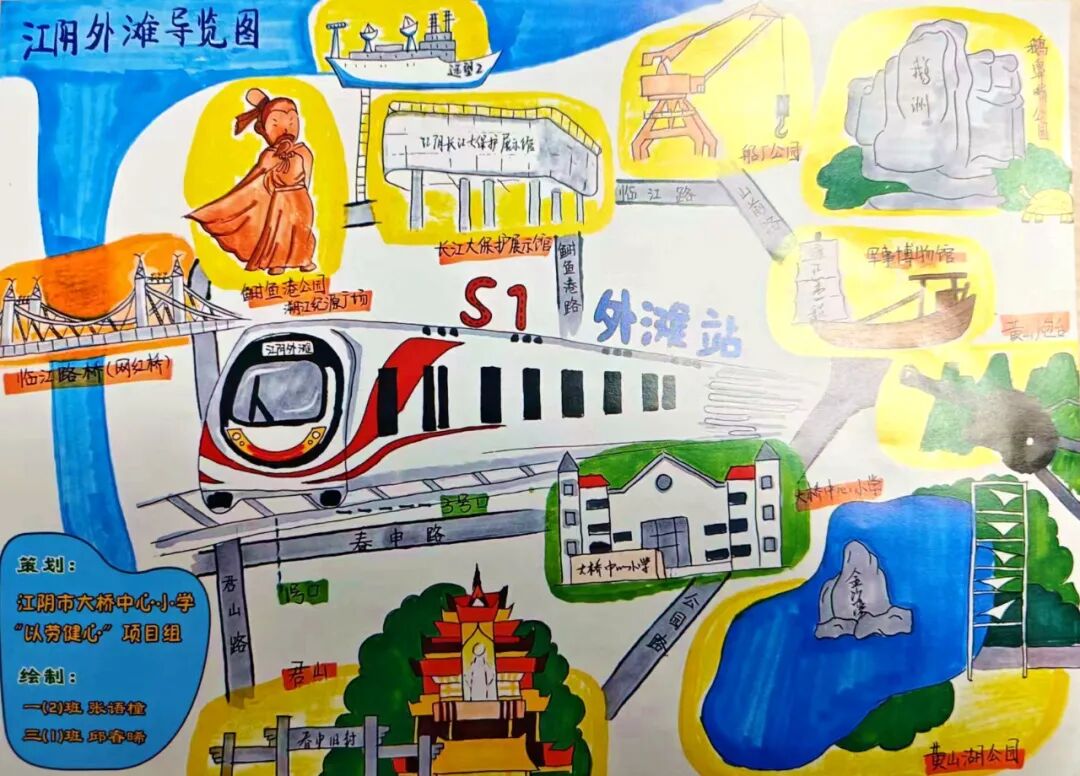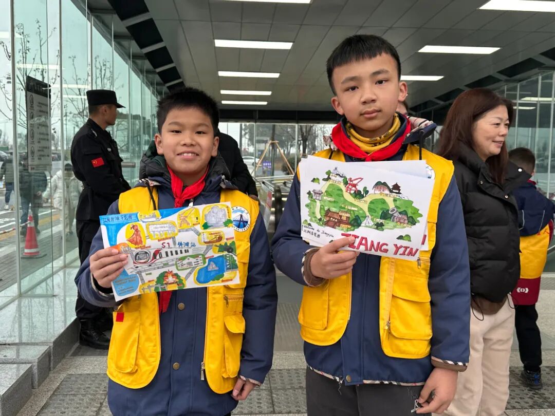 S1线通了。热情好客的江阴人也早准备好了。瞧瞧,这是大桥中心小学的孩子们在S1线的站点给来往的旅客们发放的精心绘制的S1线导览图。