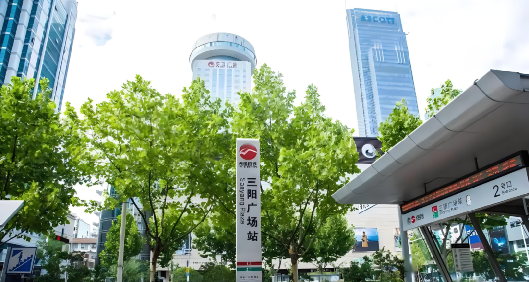 “三阳广场站”,地铁1号和2号线均经停。站内共有27个出口,号称中国最大的地铁站。其中14个是直出地面出入口,13个为与苏宁广场、恒隆广场、大东方百货、百盛等商厦连接的出入口。车站地上就是“崇安寺”等历史遗迹,一抬头,四周尽是高楼大厦。广场周边有最大的商业步行街,是无锡人流最大,最繁华的商圈。