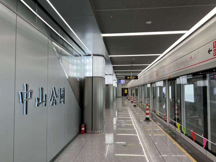 中山公园站为S1线北起第二座车站,位于人民中路与虹桥北路交叉口处,为地下二层岛式车站。中山公园站整体采用简约大气的“竹简风”设计,造型模拟书卷形态,采用并列的三连拱搭接空间层次,简洁大方,设计精美。车站地理位置优越,周边繁华的步行街与城市花园交相辉映,是人们休闲放松的理想之地。
