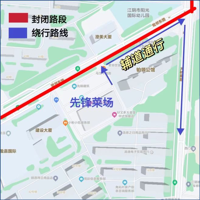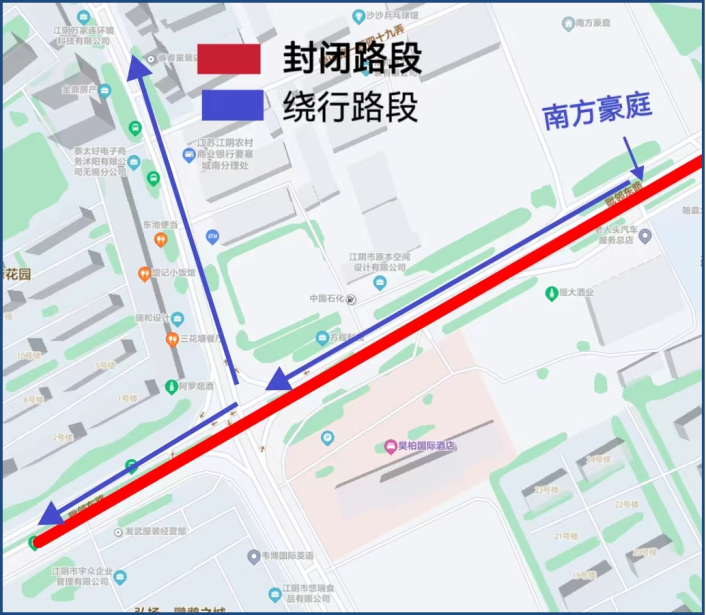 示意图解读:南方豪庭、阳光国际居民沿毗陵东路向西通行。