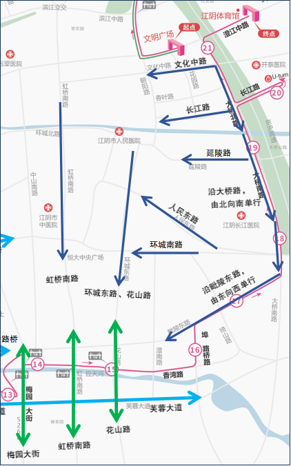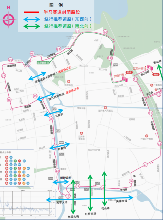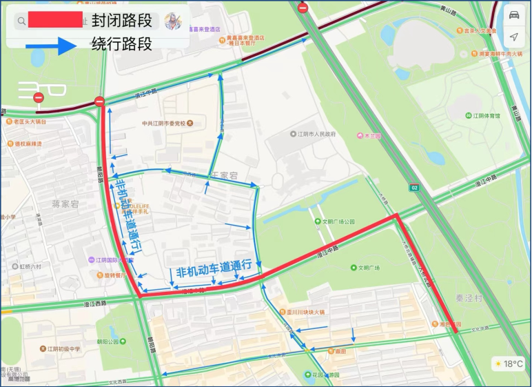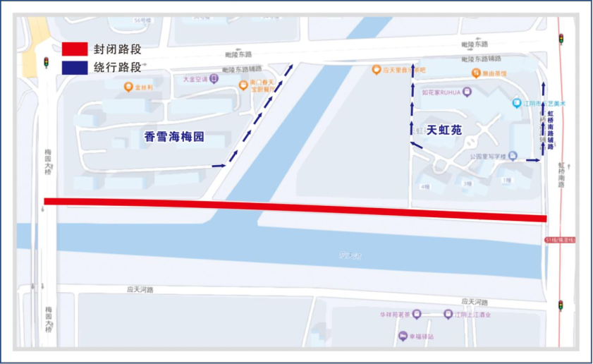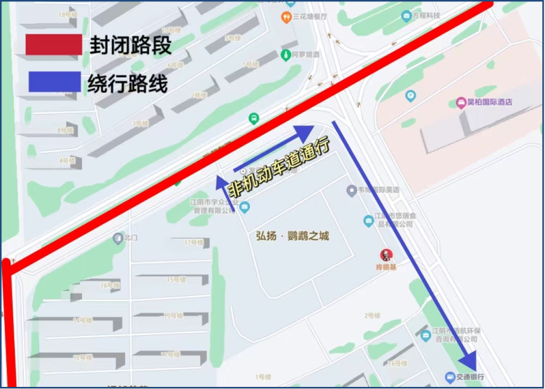 推荐绕行路线:①环城西路→梅园大街→芙蓉大道→绕行向东;②虹桥南路→芙蓉大道→绕行向东;③环城东路→花山路→芙蓉大道→绕行向东。其中,跨锡澄运河的澄江西路隧道、五星桥、杏春桥、毗陵路桥均可正常通行。