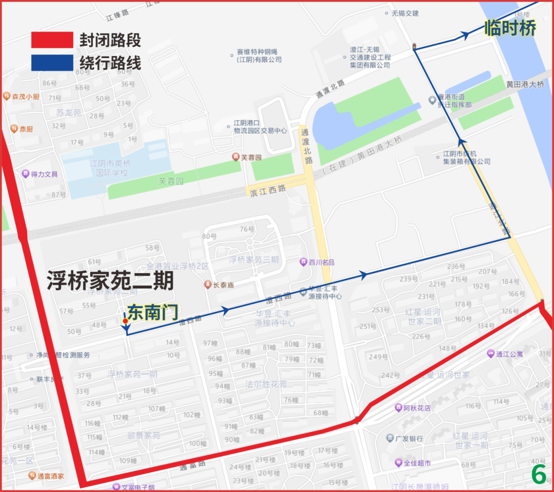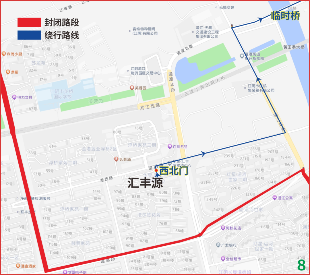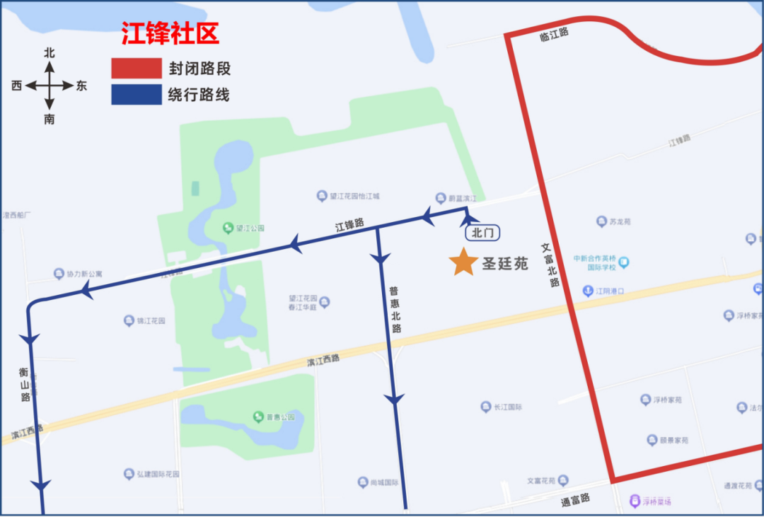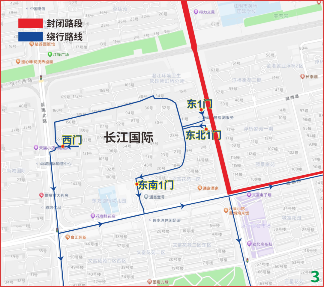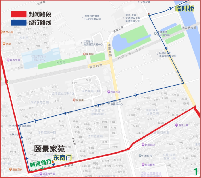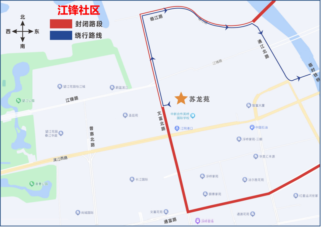 示意图解读:通富路以北区域:沿澄西路、通渡北路、通江北路至滨江路保通道路(钢便桥)向东通行;通富路以南区域:往南均正常通行。其中通富路借南半幅双向通行;长江国际小区东门不可通行,可从西门或南门通行。