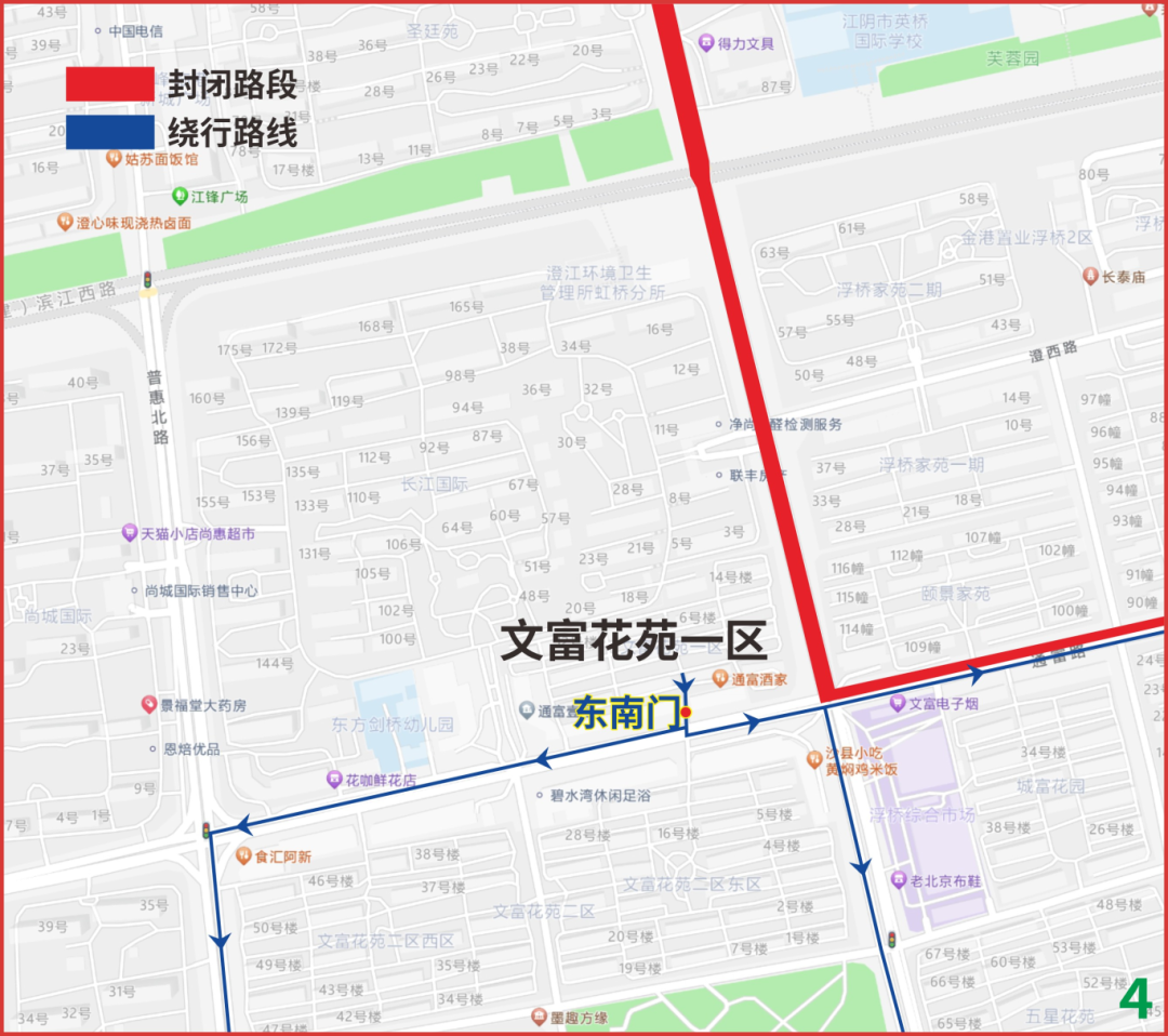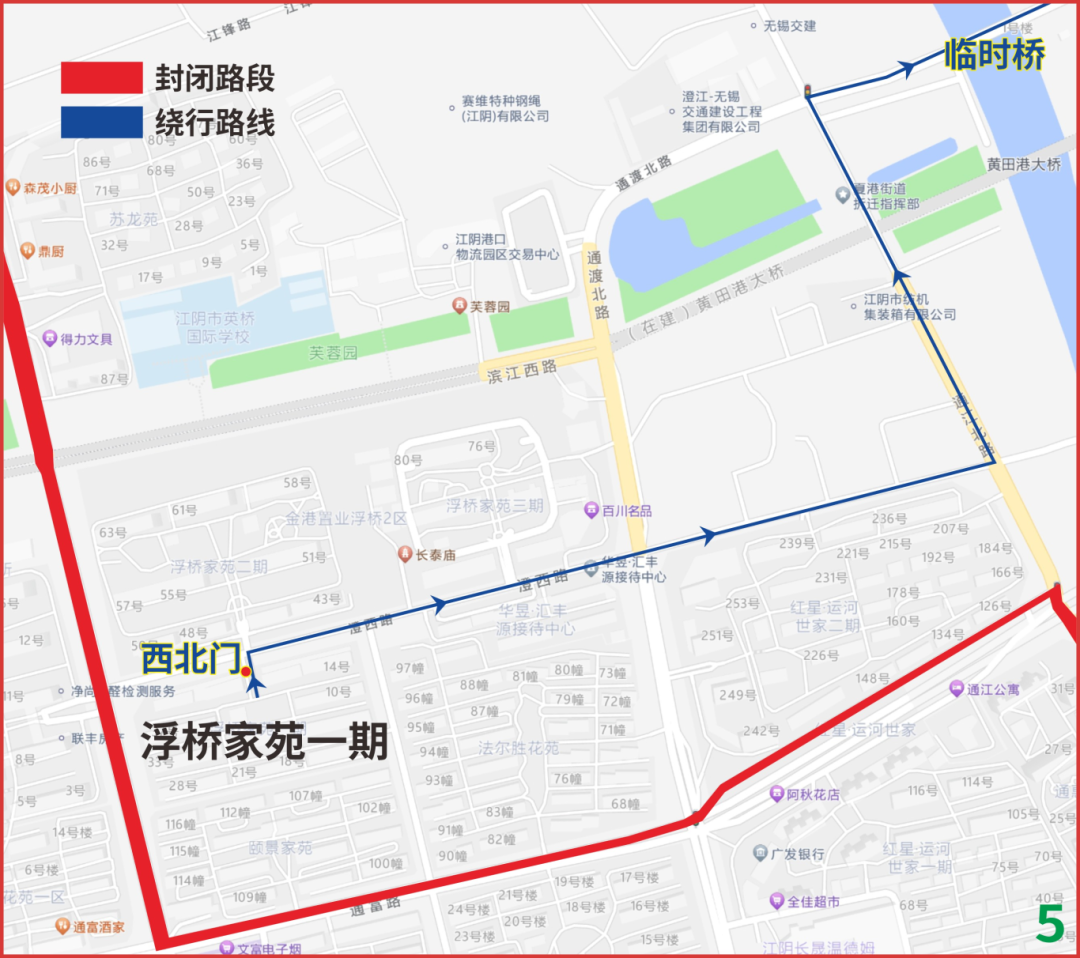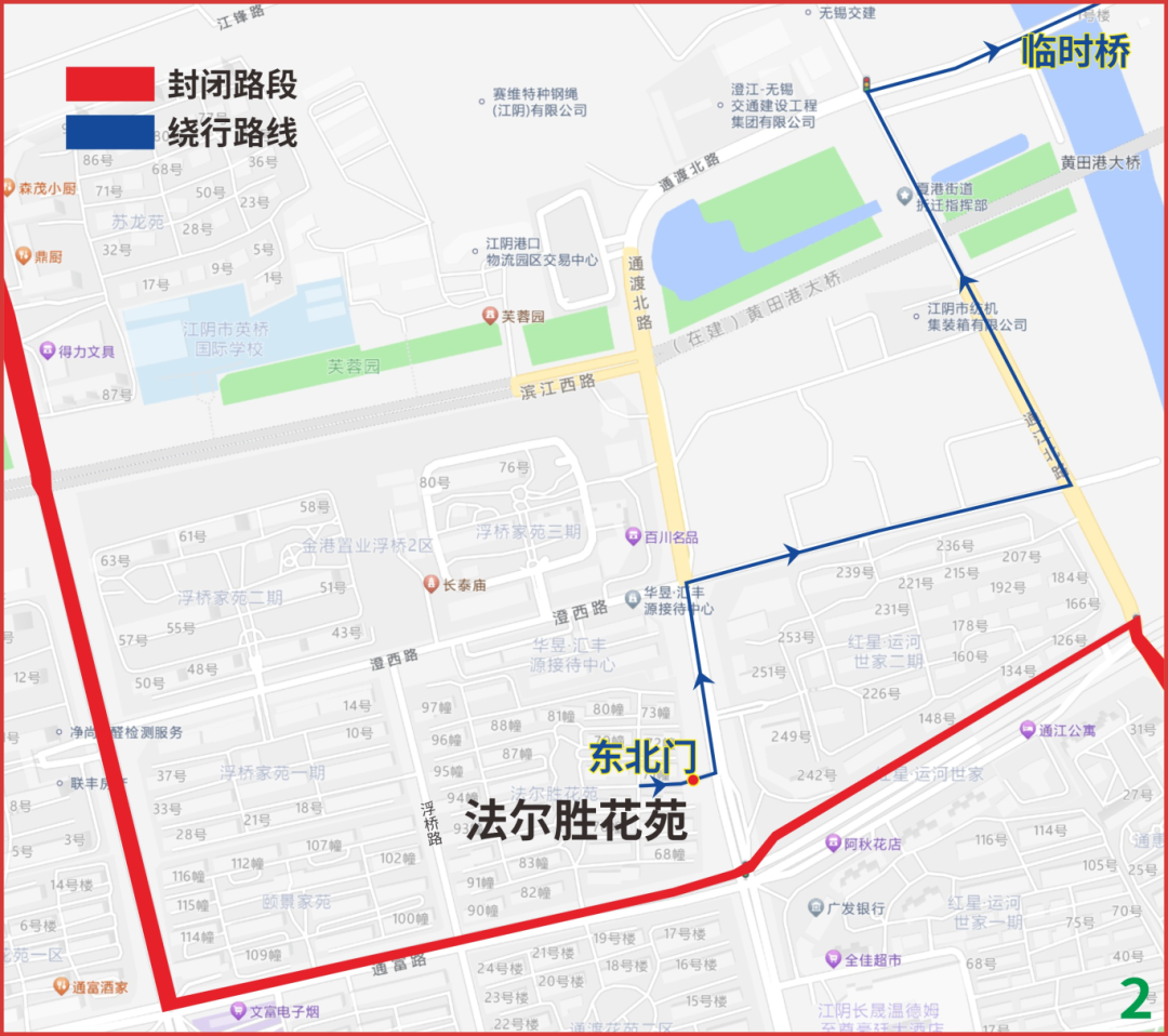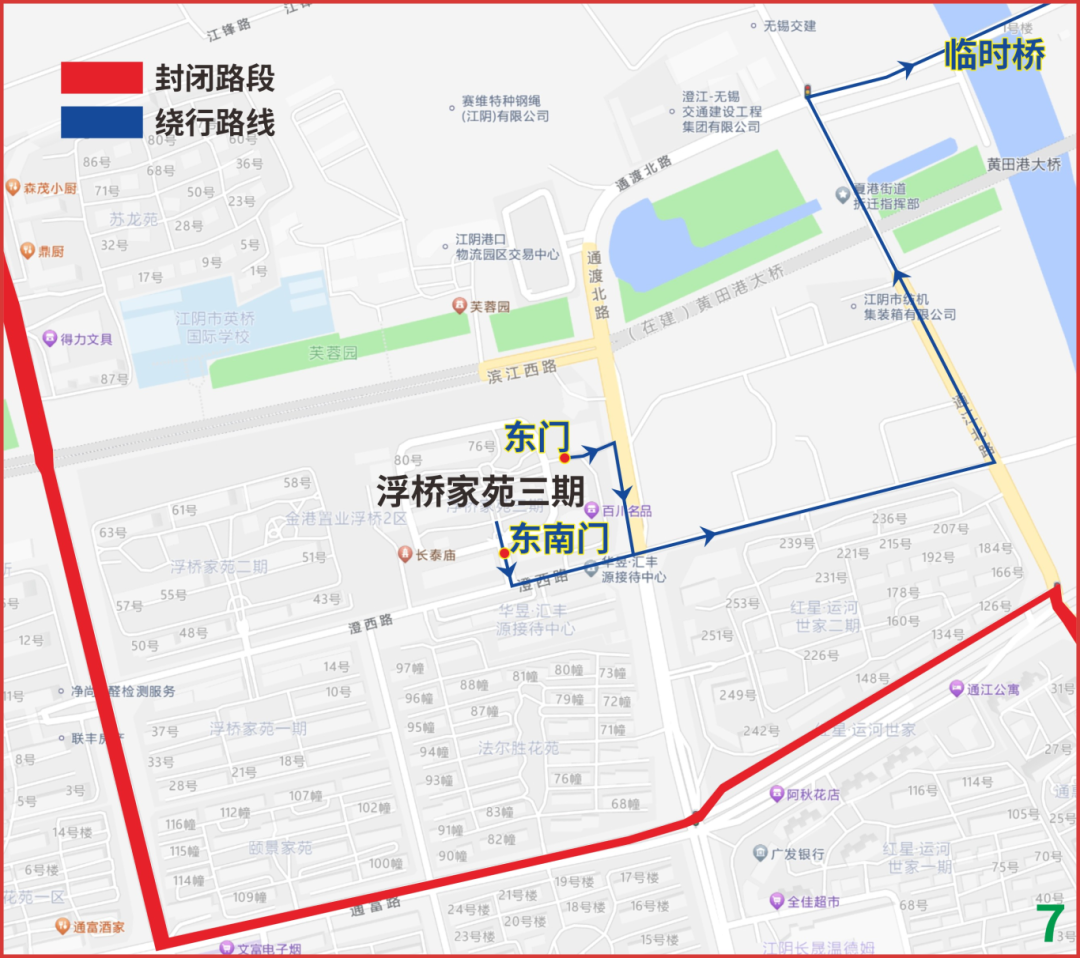 示意图解读:通富路以北区域:沿澄西路、通渡北路、通江北路至滨江路保通道路(钢便桥)向东通行;通富路以南区域:往南均正常通行。其中通富路借南半幅双向通行;长江国际小区东门不可通行,可从西门或南门通行。