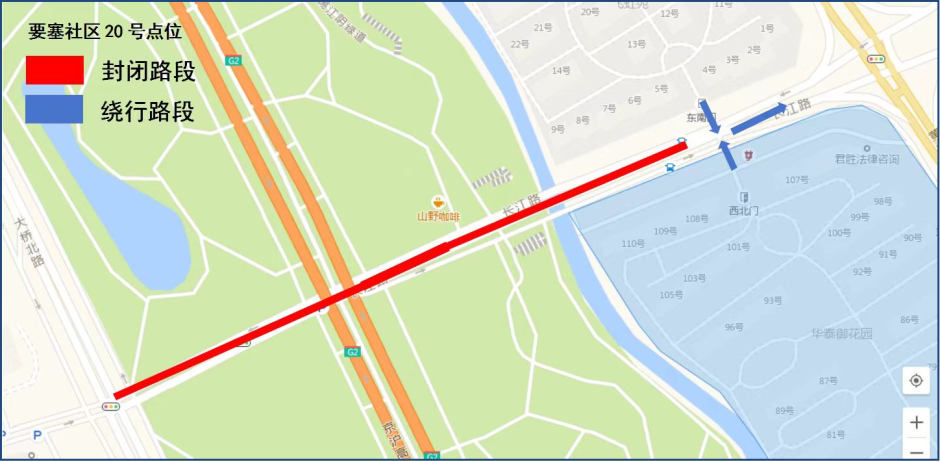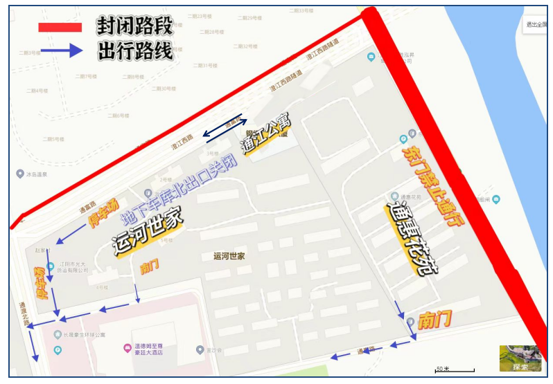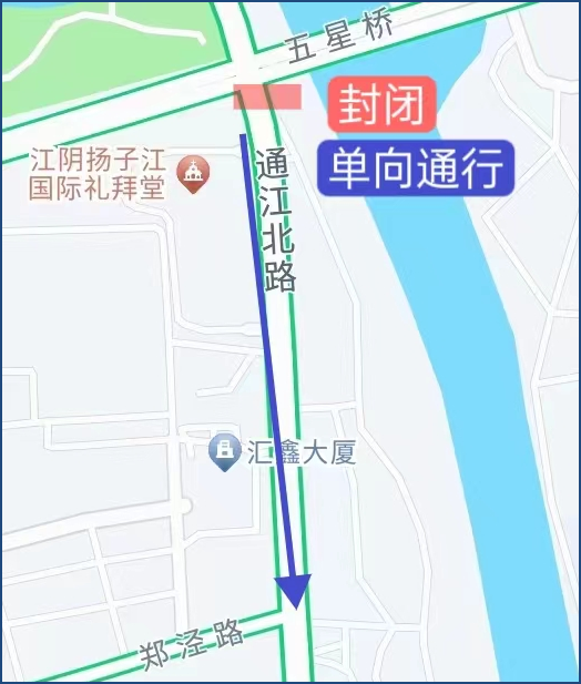 示意图解读:扬子江礼拜堂以北道路全幅封闭,五星桥以南区域居民:沿通江北路向南通行。