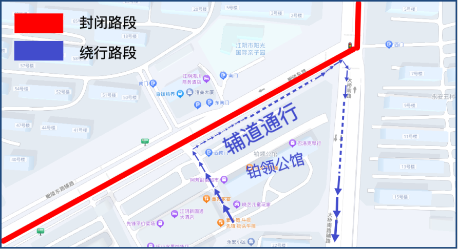 示意图解读:铂领公馆居民沿毗陵东路南侧非机动车道由西向东单向通行至大桥南路向南离开;永安五村居民出西门,沿大桥南路向南通行或借道东侧辅道向北至人民东路右转往黄山路通行。