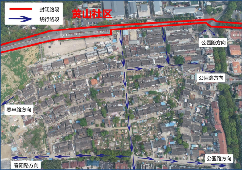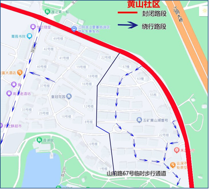 示意图解读:五矿黄山湖壹号居民的非机动车、行人可沿内部路借公园临时步行通道离开(汽车不可通行);扬子华都居民可沿春申路向南通行。