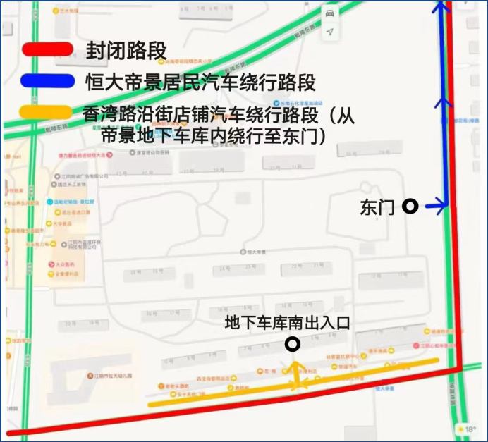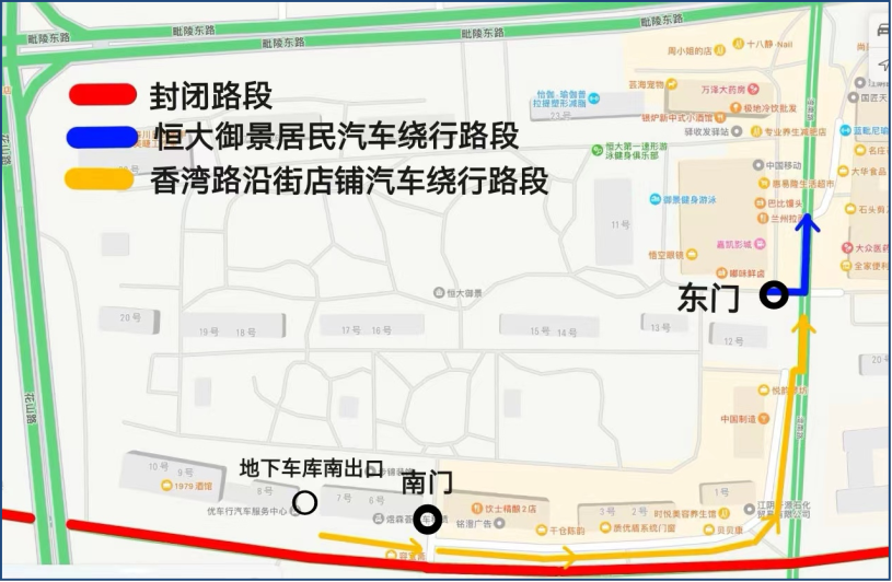 示意图解读:沿街店铺车辆借小区地下车库通行至东门出,至埠路桥路逆向借道通行;小区车辆经东门出,逆向借道埠路桥路西半幅向北至毗陵东路通行。