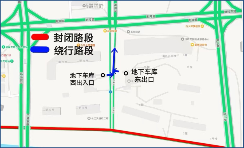 示意图解读:飞虹苑、华泰御花园居民沿长江路向东至黄山路通行,向西行驶需沿黄山路至芙蓉大道绕行。