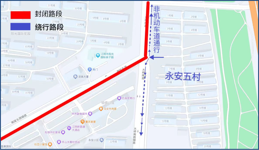 8:10起,大桥北路(人民东路—澄江中路)封闭道路中心东侧的主车道、辅车道及非机动车道禁行,预计解封时间为11:50。