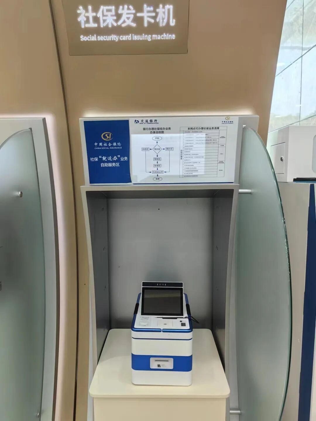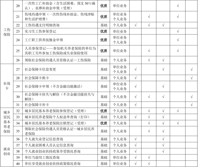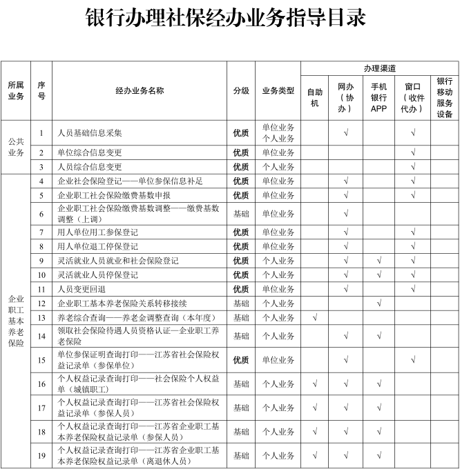 社保业务“就近办”银行合作网点是人社部门与合作银行共同建设的,以合作银行网点为载体,经办人社业务事项的便民服务点。目前,基础网点可通过合作银行自助一体机、手机银行等途径经办22项人社业务;优质网点增设社保业务专窗,可经办40项人社业务。