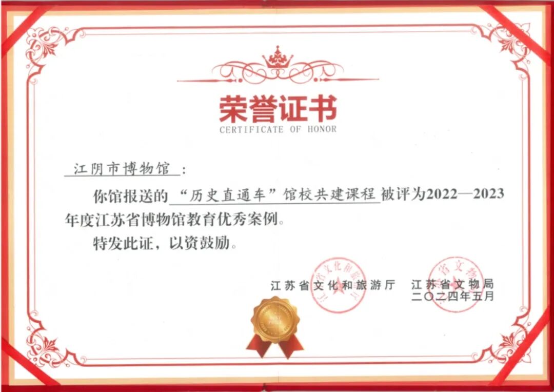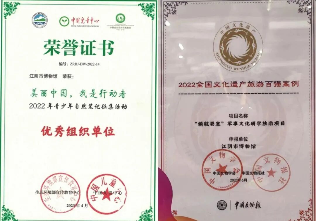 近年来,江阴市博物馆勇于探索、开拓实践,在馆藏研究、文物保护、展览陈列、教育宣传、开放服务等方面累计获得各类奖励与荣誉20余项。