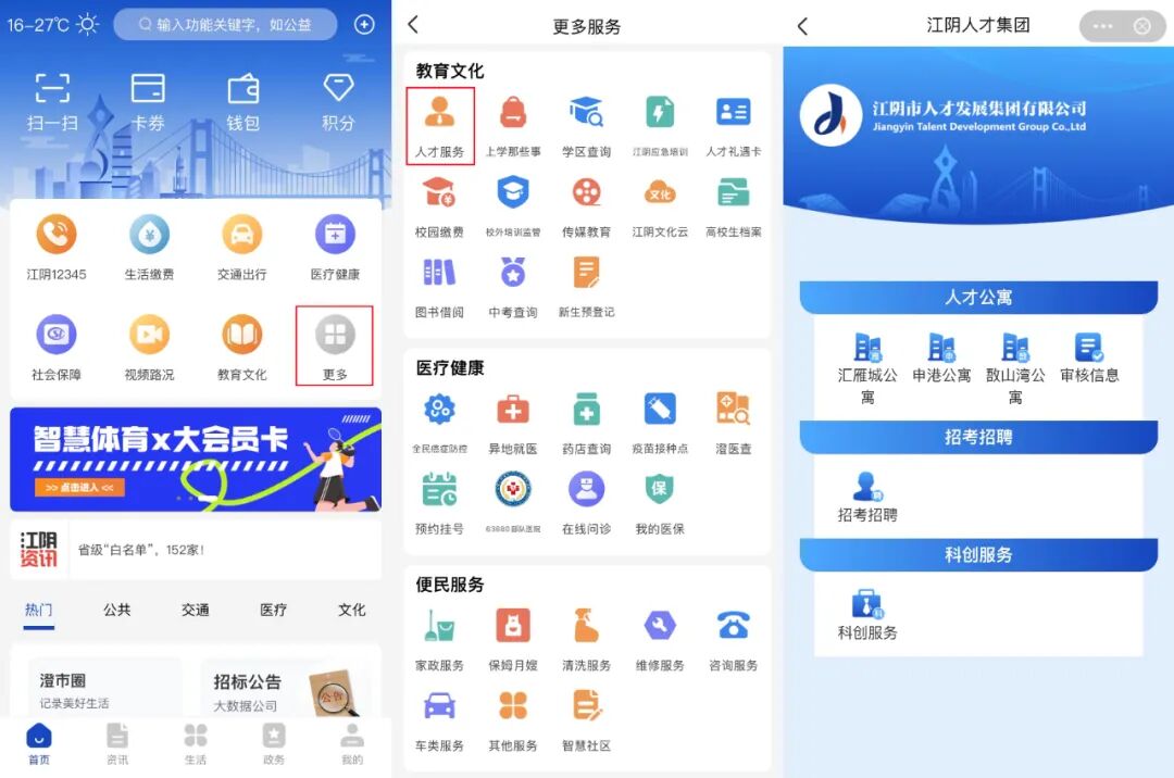 1、下载并登录最江阴app—点击更多—人才服务板块—进入申请链接