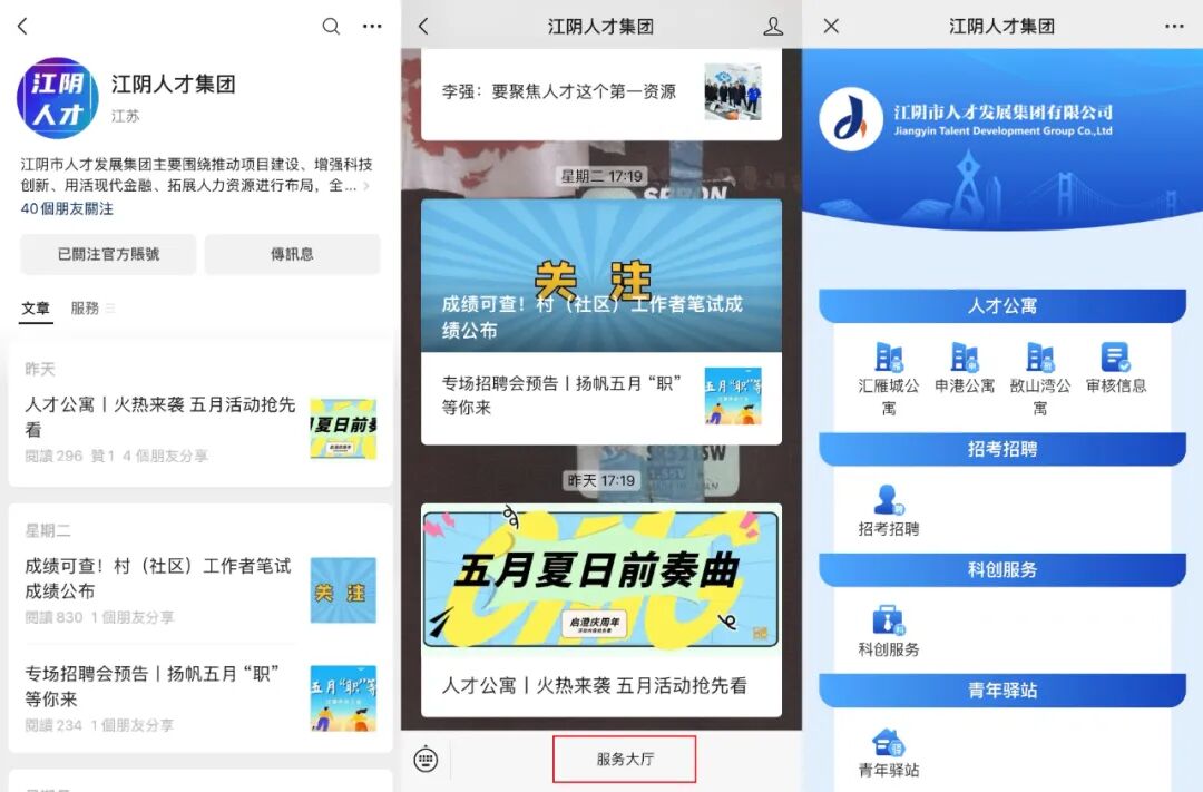 2、关注江阴人才集团公众号—点击服务大厅—进入申请链接