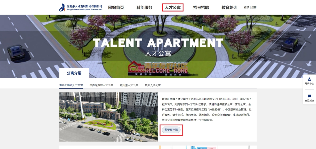 3、登录江阴市人才发展集团有限公司官网—点击人才公寓板块—进入申请链接