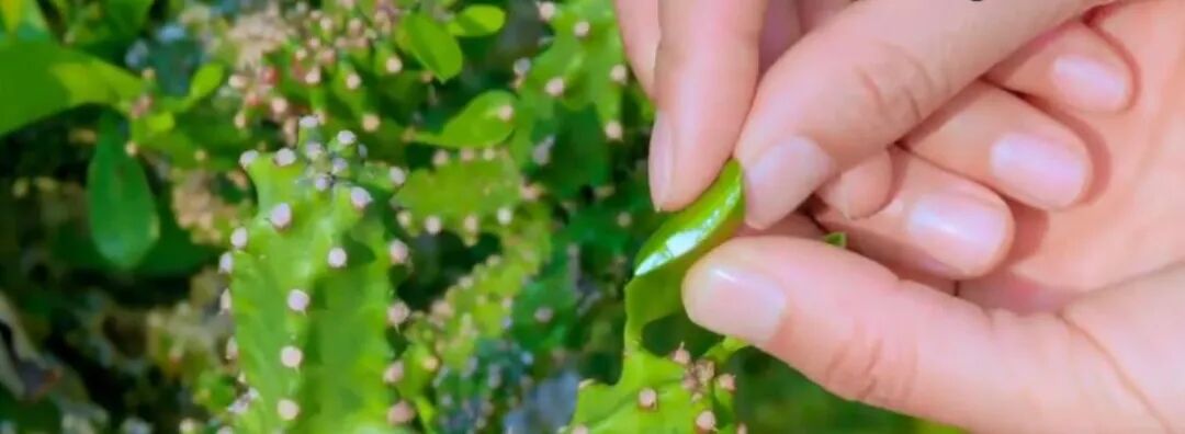 麒麟掌断面分泌的白色汁液。视频截图