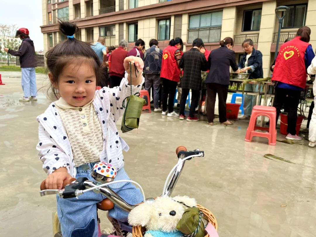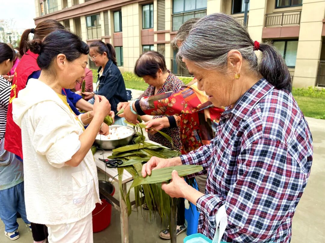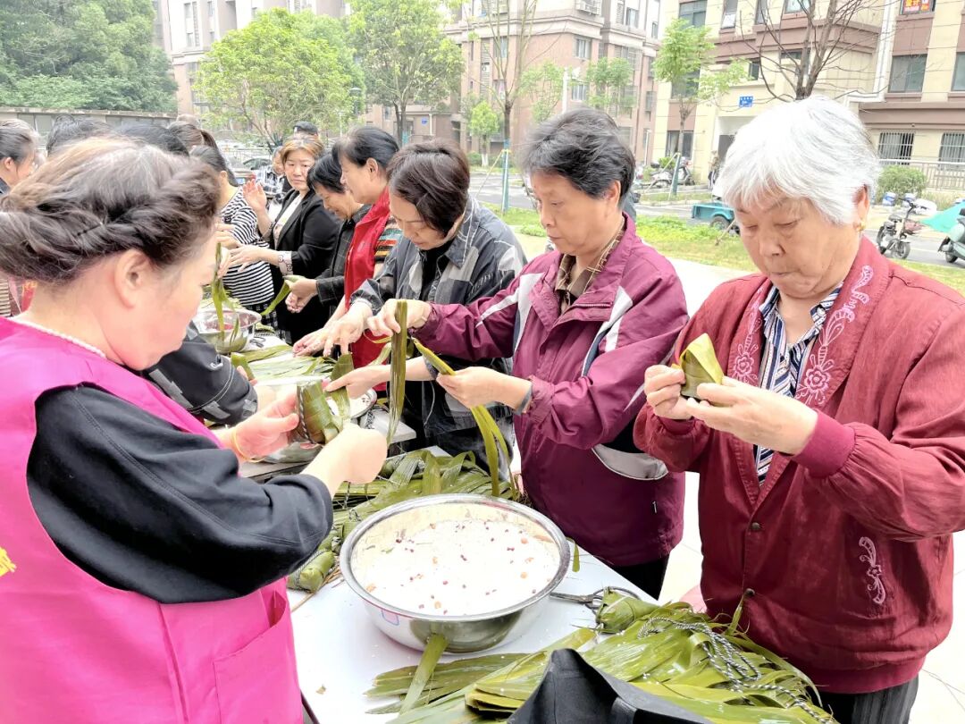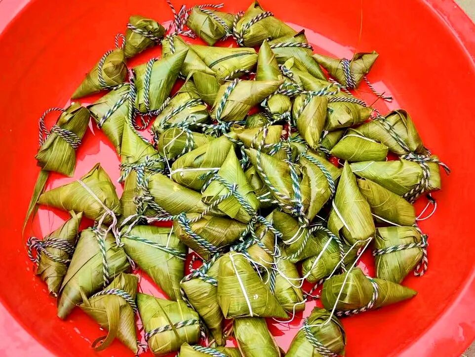 上午采回来的粽叶放在清水里浸一浸,将糯米淘好了胀一胀,下午就可以着手包了。大家围坐一起处理粽叶、包粽子、话家常,周身不仅有粽叶的浓浓香气,更有守望互助的深厚情谊,一只只精致玲珑的粽子很快在一双双巧手中成形。