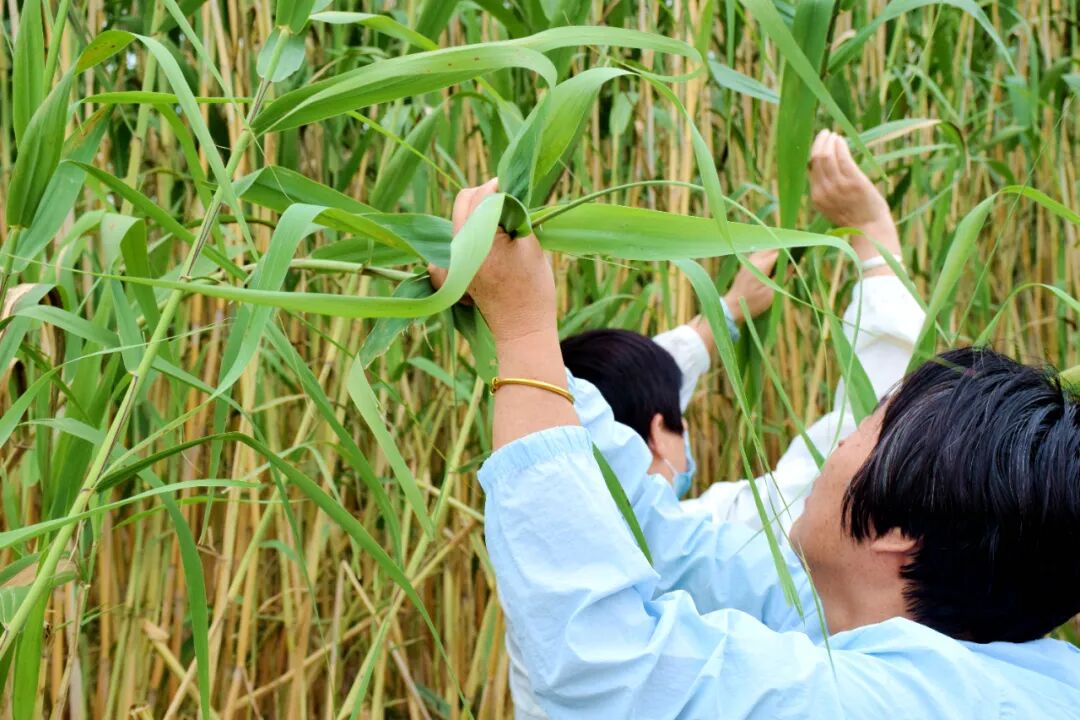 采粽叶应该算是个技术活,熟手上去会就势轻轻地压弯苇杆,用拇指和食指捏住苇叶,用个巧劲轻轻地一扽,苇叶就会压根摘下,干净利落,不会扯伤苇杆,而且一株上面只取个两三片叶子,既保证了采摘的苇叶鲜嫩,又不至于影响芦苇的继续生长。