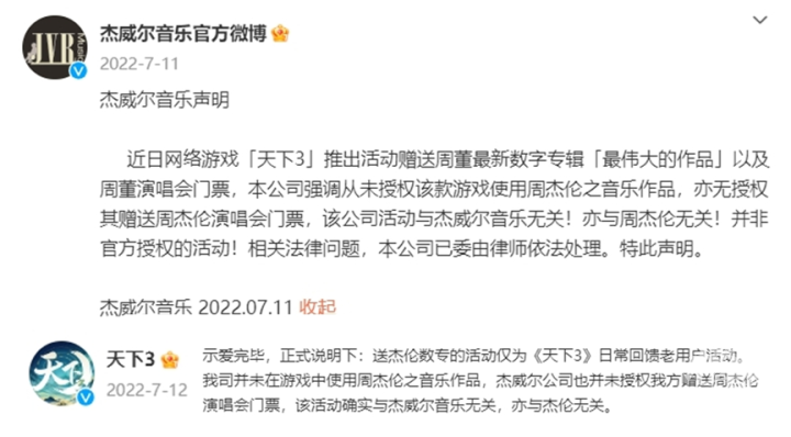 7月11日,杰威尔发布公告称将针对《天下3》私自赠送周杰伦新专辑及演唱会门票采取法律措施。该公告发布后,《天下3》第一时间删除相关活动,并发布澄清公告,表明该抽奖活动仅为回馈老用户。