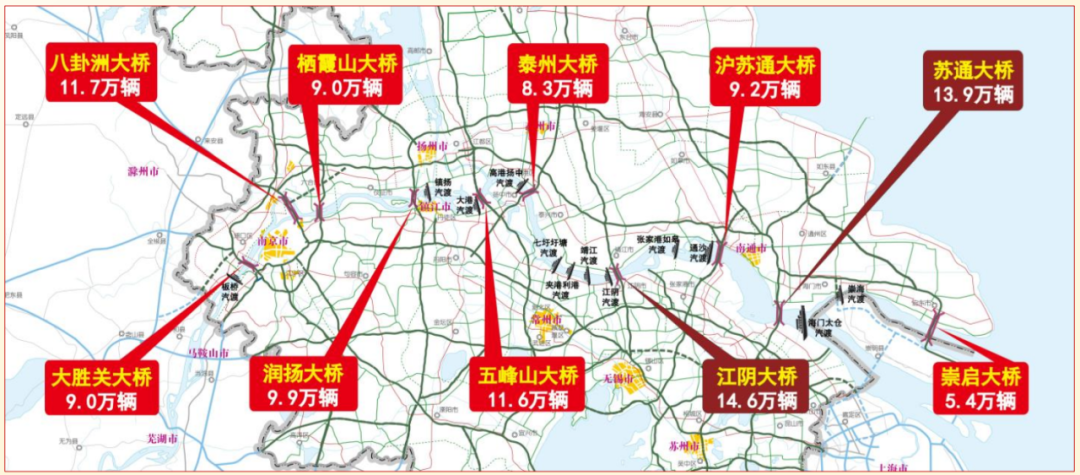 国庆期间,高速公路过江通道通行压力较大,日均过江流量预计达102.7万辆,预计同比增长5%。其中,江阴大桥过江流量预计为14.6万辆。