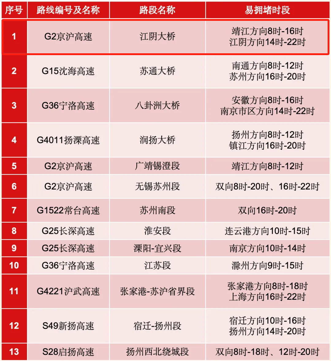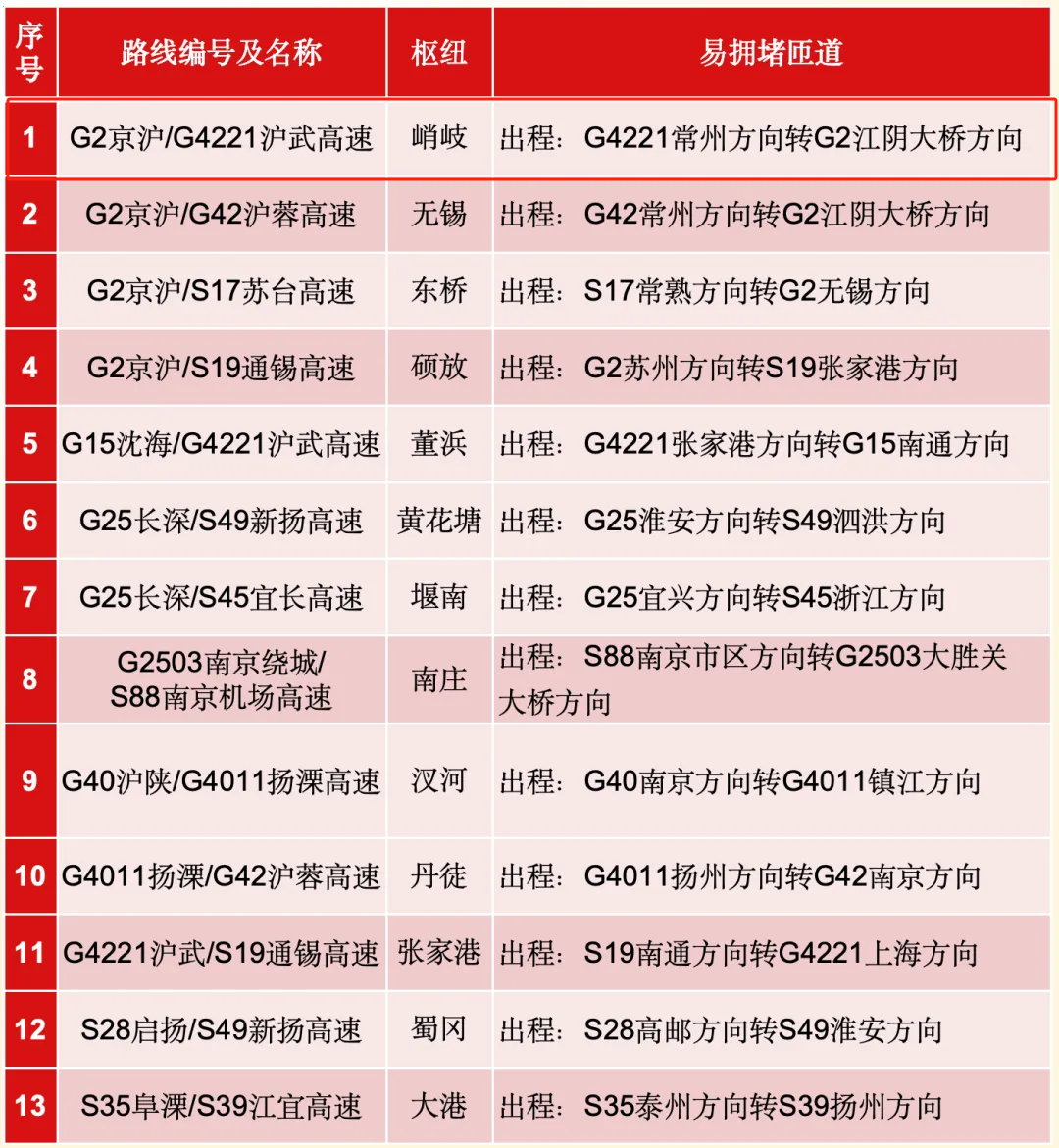 国庆期间,受跨省长途出行较多、自驾出行车辆增加等因素影响,节前的9月30日及节日期间的10月1日,全省高速公路潮汐单向车流集中,预计有江阴大桥等13个路段高峰时段易拥堵缓行。