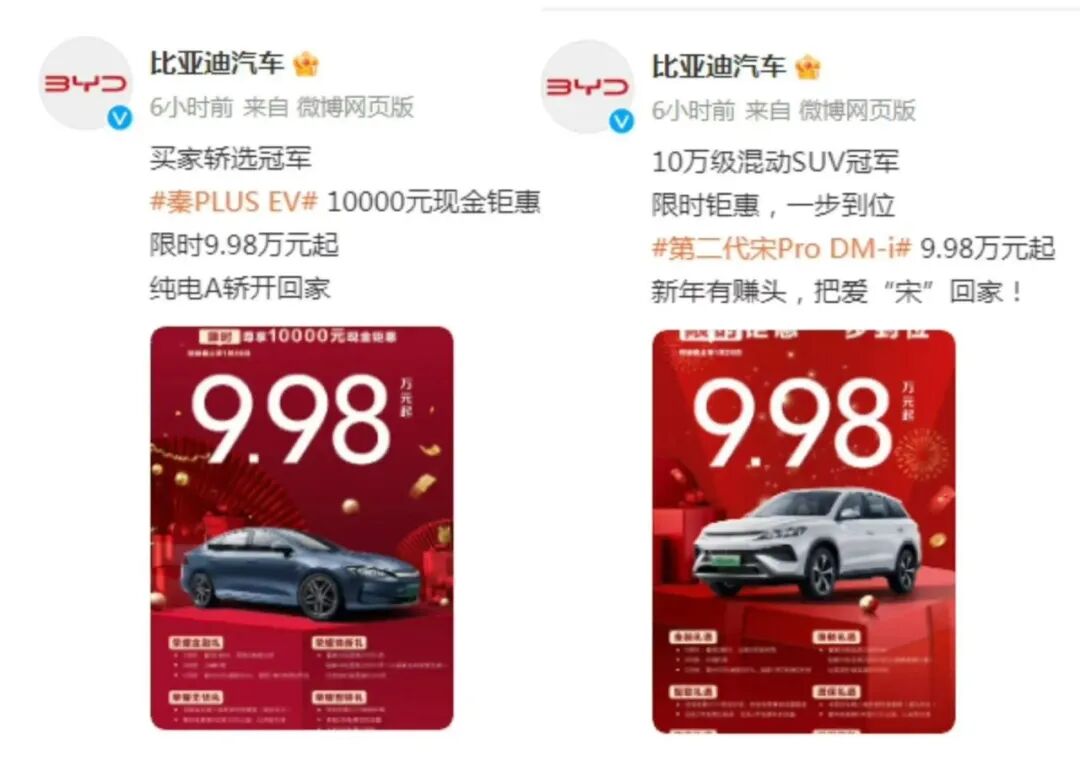 12月27日,@比亚迪汽车 发文称,即日起至2025年1月26日,对秦PLUS EV荣耀版限时优惠1万元,对第二代宋Pro DM-i也进行限时优惠活动,优惠后两款车型起售价均为9.98万元。并且,上述两款车型置换补贴最高分别为2.5万元和2.4万元。