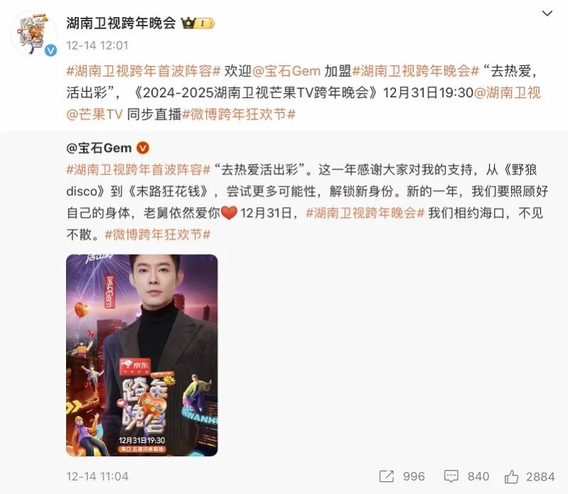 12月31日,湖南卫视跨年晚会官方微博发布《2024-2025湖南卫视芒果TV跨年晚会》节目单。节目单中删除了之前宣发的嘉宾宝石老舅。此前,宝石老舅在微博上预告,“12月31日,湖南卫视跨年晚会,我们相约海口,不见不散!”湖南卫视跨年晚会官方微博发布的“嘉宾全阵容”里也有宝石老舅。