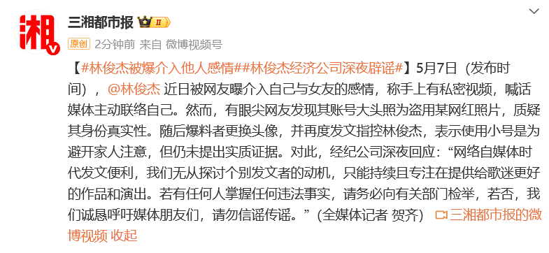 5月7日,据媒体报道,林俊杰近日被网友曝介入自己与女友的感情,称手上有私密视频,喊话媒体主动联络自己。