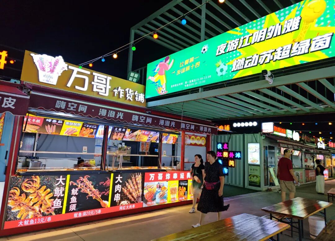 除此以外,这里的美食主街商户还外摆精美热卤、特色小吃、冰爽啤酒等给大家助兴,休闲区提供80套桌椅可供休憩,球迷们可以边撸串边畅饮,感受进球瞬间的狂欢,跟着“苏超”游外滩!