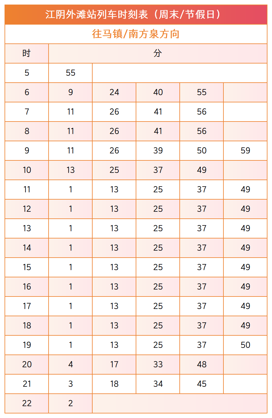 S1线江阴外滩站作为本次“澄马”赛事的接驳车站,以下为江阴外滩站的列车时刻表,供有需要的乘客进行参考: