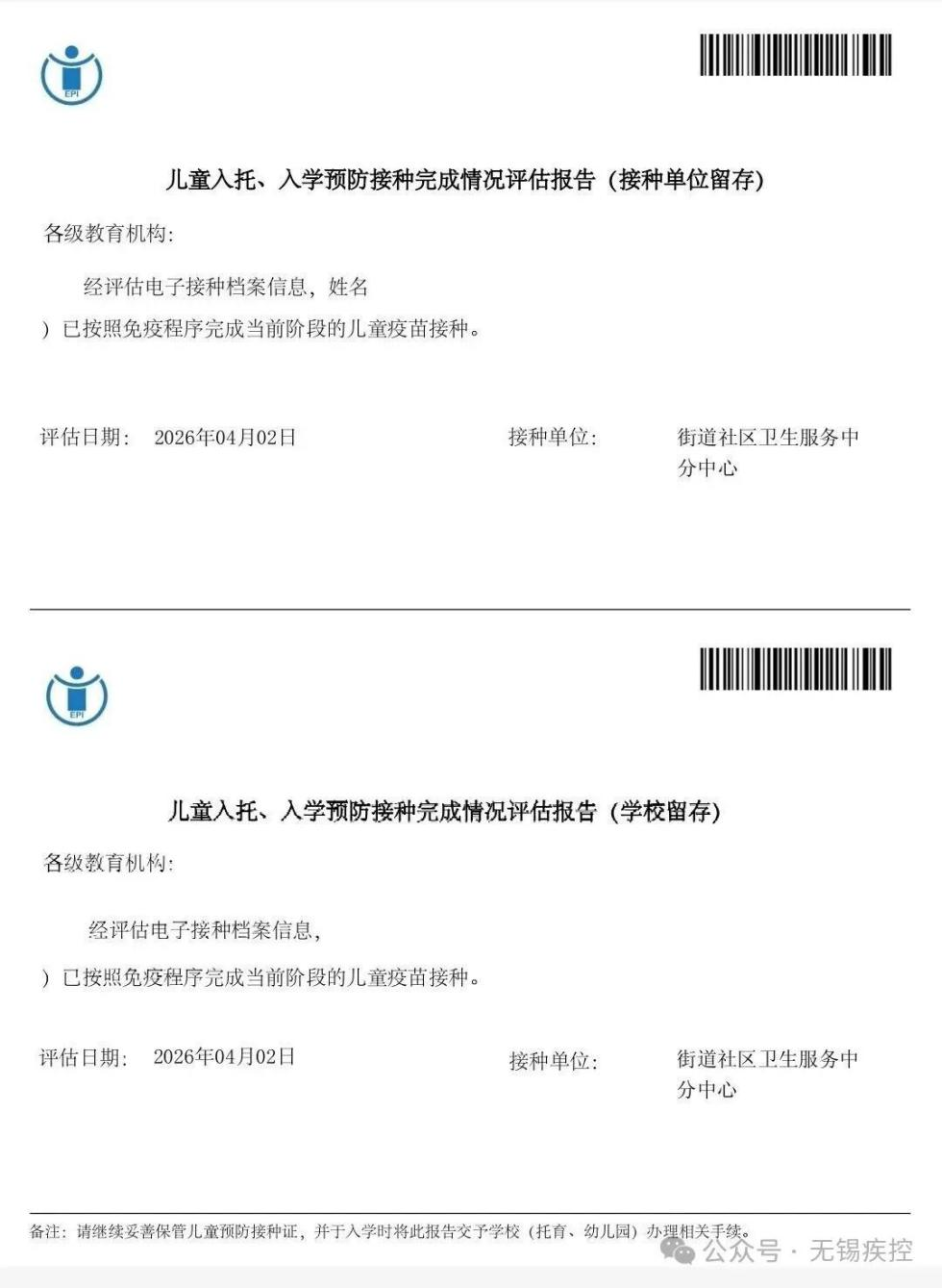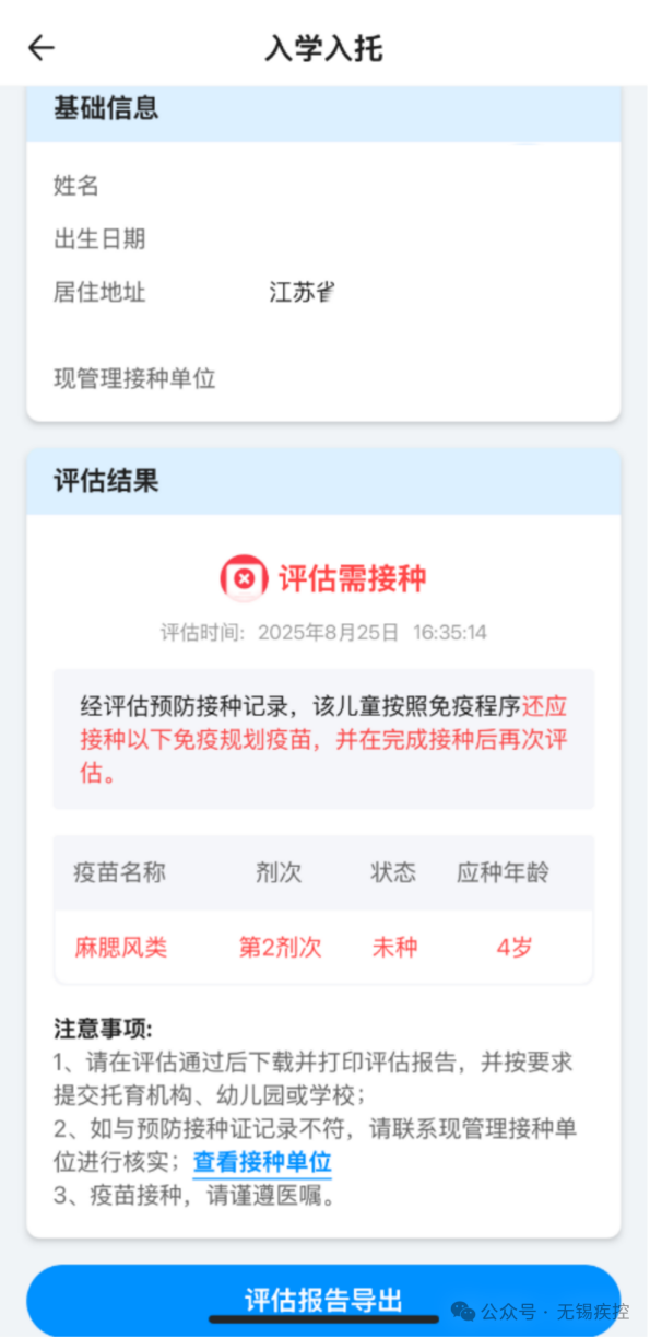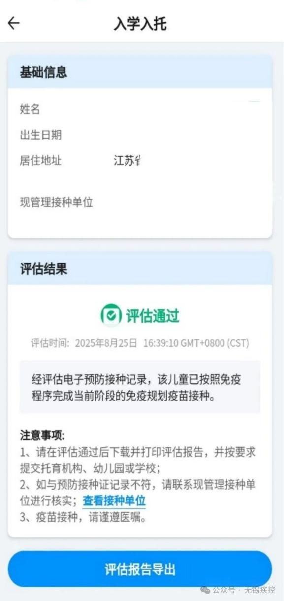 手机应用商店下载“江苏预防接种”官方APP,注册和登录后,选择“无锡市”,点击“个人中心”,点击“宝宝档案”下的“添加档案”,绑定儿童信息,点击“绑定”,点击“入学入托”,页面显示红色“评估需接种”或绿色“评估通过”均继续点击“评估报告导出”,打印后交至学校。