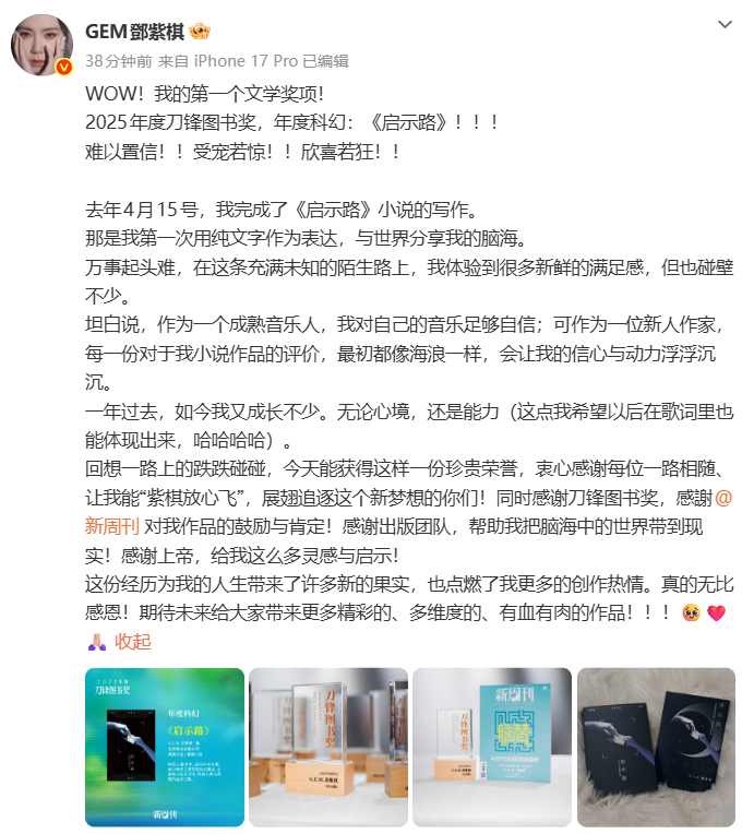 2026年1月1日,第37届“银河奖”海选投票名单公布,其中,邓紫棋2025年出版的长篇科幻小说《启示路》入选银河奖最佳原创图书票选名单。